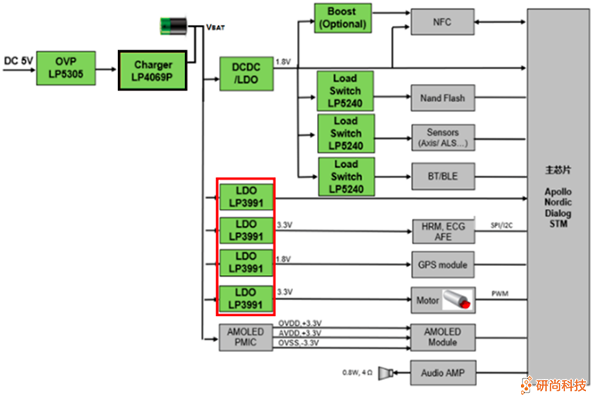 以目前可穿戴应用中份额最高的智能手环手表产品为例,不同的主芯片会有不同的电压要求,例如1.8V、3.3V等,分别为主平台模拟或者数字电路供电,系统的电源管理要求在需要时开启或关闭各个系统模块的电源。常见的开启或关闭的方式有两种:一是使用负载开关(如微源产品:可穿戴应用的低功耗小体积负载开关 - LP5240HVF);二是直接采用带使能引脚的超低静态电流的LDO。通常带使能引脚的LDO要求静态电流在5uA内。微源半导体新推出的LP3991能满足这样的要求。