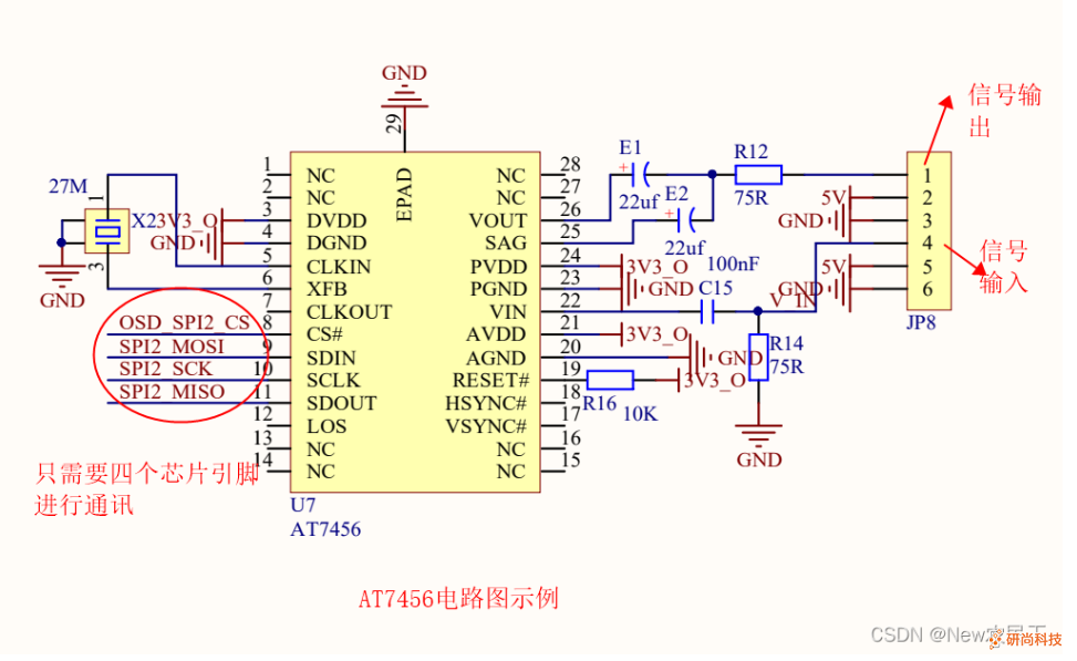 下面是AT7456部分的电路图。可以看到使用SPI与之通讯不需要额外的控制引脚。